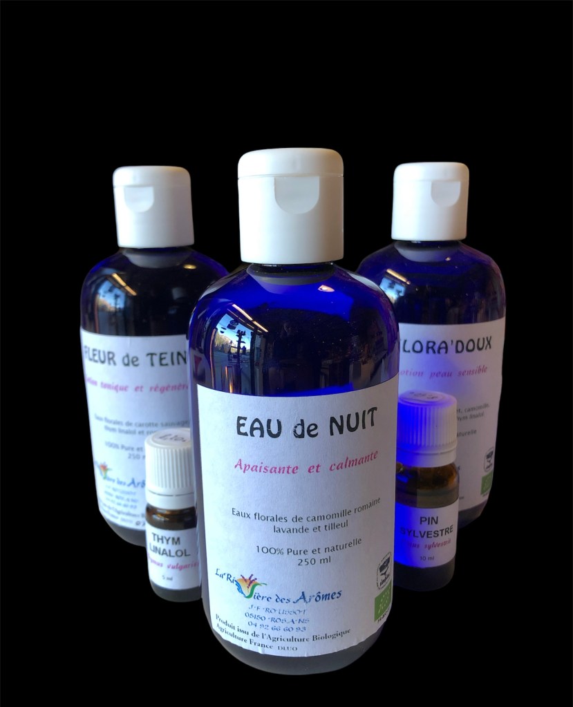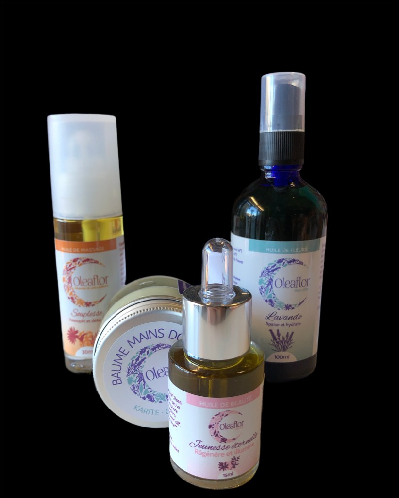 Bien-être Huiles essentielles et eaux florales de la Rivières des arômes. Baumes et huiles de massage d’Oléaflor.