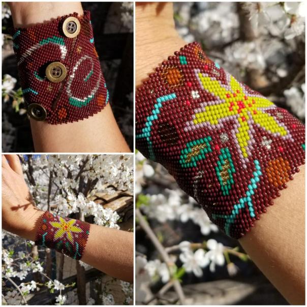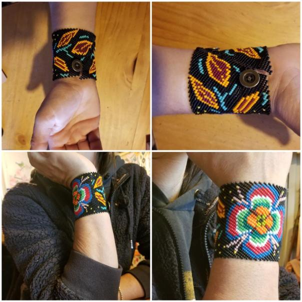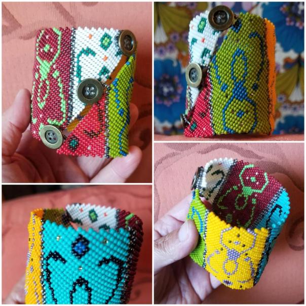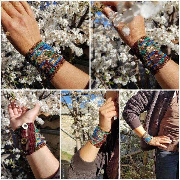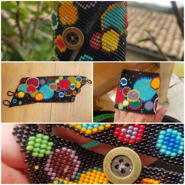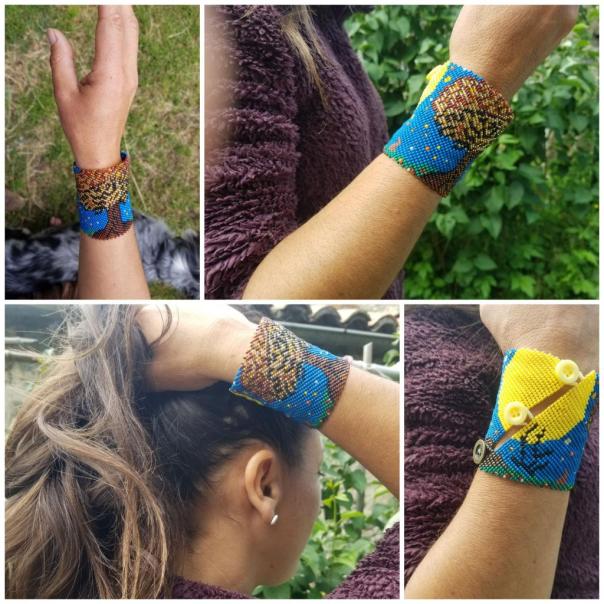 Diane tisse des perles de rocaille (de verre) de 2 mm depuis plus de 15 ans. Elle a mis au point une technique de tissage inédite qui rend ses bracelets manchettes très solides. Ces derniers sont pour elle comme des tatouages, des décorations pour la peau avec 4600 perles par bracelet , une grande diversité de couleurs et de styles. Ses créations sont uniques et originales. Ces pièces sont résistantes à l’eau et les couleurs ne ternissent pas.